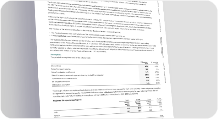 NOTES TO THE FINANCIAL STATEMENTS CONTINUED S S 25 PROVISIONS TR 26 PENSION OBLIGATIONS CONTINUED TR 2023 2022 A Defined Benefit scheme continued A £m £m TE On 18 December 2020, the Group agreed to increase the recovery plan contributions from £7.1m per annum to £15.0m per annum effective from TE Warranty Total Restructuring Warranty Total G G I I C 1 January 2021 through to 30 June 2027. Estimated contributions for the year ending 31 December 2024 are £15.0m, although this is subject to C At the beginning of the year 41.1 41.1 0.4 38.5 38.9 Rconsideration as part of the 6 April 2023 valuation, due by July 2024. R Charge for the year 29.7 29.7 – 30.9 30.9 E E P P O The 6 April 2020 valuation was updated by an independent qualified actuary to 31 December 2022 for the 2022 year-end disclosures in accordance with O Utilisation (27.4) (27.4) (0.4) (26.5) (26.9) R R Effect of movements in exchange rates 0.7 0.7 – (1.5) (1.5) TIAS 19R. The initial results of the 6 April 2023 valuation were updated by an independent qualified actuary to 31 December 2023 for the 2023 year-end T disclosures in accordance with IAS 19R. The ongoing valuation as at 6 April 2023 is due to be completed by July 2024 in line with the scheme-specific Release to the Income Statement (0.2) (0.2) – (0.3) (0.3) funding requirements of the Pensions Act 2004. As part of that valuation the Trustee and the Group will review the adequacy of the contributions being At the end of the year 43.9 43.9 – 41.1 41.1 G G O paid into the scheme. O VE VE R Following the High Court ruling in the case of Virgin Media Limited v NTL Pension Trustees II Limited and others in June 2023, it was held that section 37 R NAN NAN Analysed as: of the Pension Schemes Act 1993 operates to make void any amendment to the rules of a contracted out pension scheme without written actuarial Current 20.2 20.2 – 18.6 18.6 confirmation under Regulation 42(2) of the Occupational Pension Schemes (Contracting Out) Regulations 1996, in so far that the amendment relates C C Non-current 23.7 23.7 – 22.5 22.5 Eto members’ section 9(2B) rights. An appeal is due to be heard on 26 June 2024 which, it is hoped, will provide further clarity on the issue. E 43.9 43.9 – 41.1 41.1 The Trustees of the Scheme and the Plan (collectively the “Pension Schemes”) have confirmed that; F F I I In the year ended 31 December 2020, the Group launched a consultation process to reduce employee numbers reflecting lower than originally planned NAN– The Pension Schemes were contracted out of the additional state pension between 1997 and 2016; and NAN production volumes resulting in an exceptional charge to the Consolidated Income Statement in 2020. The restructuring was substantially completed – It was possible that amendments were made to the Pension Schemes that may have impacted on the members’ section 9(2B) rights. C C during 2021, with the final amounts being utilised during the year ended 31 December 2022. IALThe Trustees of the Pension Schemes and the Directors work closely together and take appropriate legal and professional advice when making IAL The warranty provision is calculated based on the level of historical claims and is expected to be substantially utilised within the next three years. Samendments to the Pension Schemes. However, at 31 December 2023, it is not currently possible to determine whether any amendments to section 9(2B) S T T A rights were made to the Pension Schemes that were not in accordance with section 37 of the Pension Schemes Act 1993 requirements. Further, it is not A 26 PENSION OBLIGATIONS T T E currently possible to reliably estimate the possible impact to the defined benefit obligations of the Pension Schemes if these amendments were not in E Defined contribution scheme M M E accordance with section 37 of the Pension Schemes Act 1993 requirements. E The Group opened a Defined Contribution scheme in June 2011. The total expense relating to this scheme in the year ended 31 December 2023 was N N T T £20.9m (2022: £17.6m). Outstanding contributions at the 31 December 2023 were £1.9m (2022: £1.5m). Contributions are made by the Group to other SAssumptions S pension arrangements for certain employees of the Group. The principal assumptions used by the actuary were: F 31 December 31 December F Defined Benefit scheme U 2023 2022 U R R The Group operates a Defined Benefit Pension Scheme. During 2017, it was agreed and communicated to its members that the scheme’s benefits would be T T H Discount rate 4.7% 4.85% H amended from a final pensionable salary basis to a career average revalued earnings (CARE) basis with effect from 1 January 2018. The scheme was closed E E R Rate of increase in salaries N/A N/A R to new entrants on 31 May 2011. The benefits of the existing members were not affected by the closure of the scheme. The assets of the scheme are held INFRate of revaluation in deferment 2.4% 2.45% INF separately from those of the Group. On 31 January 2022, the scheme was closed to future accrual resulting in a curtailment loss of £2.8m (note 5). OR Rate of increase in pensions in payment attracting Limited Price Indexation 2.85% 2.95% OR In constructing the investment strategy for the scheme, the Trustees take due account of the liability profile of the scheme along with the level of disclosed MExpected return on scheme assets 4.7% 4.85% M surplus or deficit. The investment strategy is reviewed on a regular basis and, at a minimum, on a triennial basis to coincide with actuarial valuations. The A A T T I RPI Inflation assumption 2.9% 3.00% I primary objectives are to provide security for all beneficiaries and to achieve long-term growth sufficient to finance any pension increases and ensure the ONCPI Inflation assumption 2.4% 2.45% ON residual cost is held at a reasonable level. The pension scheme operates under the regulatory framework of the Pensions Act 2004. The Trustee has the primary responsibility for governance of th