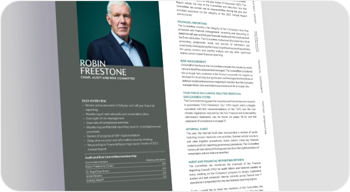 GOVERNANCE AUDIT AND RISK COMMITTEE REPORT S Audit and Risk Committee Report DEAR SHAREHOLDER TR On behalf of the Audit and Risk Committee, I am pleased to present A the Committee’s Report for the year ended 31 December 2023. This TE G I Report details the role of the Committee and describes how the C Committee has carried out its responsibilities during the year and R E provided assurance on the integrity of the 2023 Annual Report P O and Accounts. R T FINANCIAL REPORTING The Committee monitors the integrity of the Company’s reporting G O processes and financial management, reviewing and discussing in VE detail the half year and full year financial results and the conclusions of R the External Auditor. The Committee reviews and discusses the critical NAN accounting judgements made and sources of estimation and C uncertainty when applying the Group’s significant accounting policies, E the going concern and viability analysis and any other significant matters which impact financial reporting. F I RISK MANAGEMENT NAN On behalf of the Board, the Committee oversees the process by which C IAL ROBIN risks are identified, assessed and managed. The Committee considered the principal risks contained in the Group’s corporate risk register as S T FREESTONE the basis for its activity during the year and leverages the three lines of A T CHAIR, AUDIT AND RISK COMMITTEE defence model and assurance mapping to monitor how the Company E M manages these risks and obtains assurance over its principal risks. E N T S TASK FORCE ON CLIMATE-RELATED FINANCIAL DISCLOSURES (TCFD) F 2023 OVERVIEW The Committee recognises the importance of the disclosures required U R – Review and assessment of full year and half year financial in accordance TCFD framework. Our TCFD report which is largely T H reporting consistent with the recommendations of the TCFD and the new E R – Monitoring of internal audits and remediation plans climate regulations required by the Non Financial and Sustainability INF – Oversight of risk management Information Statement, can be found on pages 58-63 and the – Overview of compliance activities statement of compliance is on page 71. OR M – Monitoring confidential reporting reports, investigations and A INTERNAL AUDIT T processes I – Review of progress of ERP implementation This year, the Internal Audit plan incorporated a number of audits ON – Deep dive on cyber and information security strategy including human resources core activities, finished vehicle inventory – Responding to Financial Reporting Council review of 2022 and sales logistics procedures, Aston Martin China key financial Annual Report controls and ESG reporting governance procedures. The Committee reviews all Internal Audit findings and monitors the implementation of Audit and Risk Committee membership remediation actions that are identified. Committee members Meeting attendance Robin Freestone (Chair) 4/4 AUDIT AND FINANCIAL REPORTING REFORM Sir Nigel Boardman 4/4 The Committee has monitored the proposals of the Financial Anne Stevens 4/4 Reporting Council (FRC) for audit reform and received updates at Antony Sheriff 2/2 every meeting on the Company’s progress to design, implement, embed and test enhanced internal controls across finance and IT operations in preparation for the new financial reporting regime. Finally, I would like to thank the members of the Committee, the management team, Internal Audit and our External Auditor for their continued commitment throughout the year, for the open discussions that take place in our meetings and for the contribution they all provide in support of the Committee’s work. ROBIN FREESTONE CHAIR, AUDIT AND RISK COMMITTEE 27 February 2024 ASTON MARTIN LAGONDA ANNUAL REPORT AND ACCOUNTS 2023 98