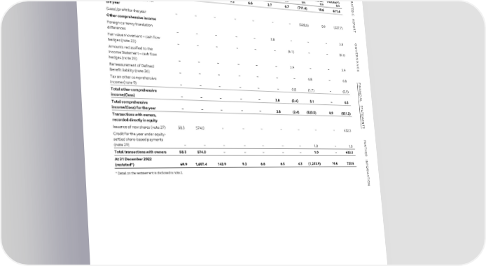 FINANCIAL STATEMENTS CONSOLIDATED STATEMENT OF CHANGES IN EQUITY CONTINUED Capital Retained Non- Total S Share Share Merger redemption Capital Translation Hedge earnings controlling Equity TR capital premium reserve reserve reserve reserve reserves (restated*) interest (restated*) A Group £m £m £m £m £m £m £m £m £m £m TE G I At 1 January 2022 (restated*) 11.6 1,123.4 143.9 9.3 6.6 2.7 6.7 (711.4) 18.6 611.4 C Total comprehensive loss for R E the yea P r O R (Loss)/profit for the year – – – – – – – (528.6) 0.9 (527.7) T Other comprehensive income Foreign currency translation G O differences – – – – – 3.8 – – – 3.8 Fair value movement – cash flow VE R hedges (note 23) – – – – – – (6.1) – – (6.1) Amounts reclassified to the NAN Income Statement – cash flow C E hedges (note 23) – – – – – – 2.9 – – 2.9 Remeasurement of Defined F Benefit liability (note 26) – – – – – – – 6.8 – 6.8 I Tax on other comprehensive NAN income (note 9) – – – – – – 0.8 (1.7) – (0.9) C Total other comprehensive IAL S income/(loss) – – – – – 3.8 (2.4) 5.1 – 6.5 T Total comprehensive A T income/(loss) for the yea E r – – – – – 3.8 (2.4) (523.5) 0.9 (521.2) M Transactions with owners, E N T recorded directly in equity S Issuance of new shares (note 27) 58.3 574.0 – – – – – – – 632.3 Credit for the year under equity- F settled share-based payments U R T (note 29) – – – – – – – 1.0 – 1.0 H Total transactions with owners 58.3 574.0 – – – – – 1.0 – 633.3 E R At 31 December 2022 INF (restated*) 69.9 1,697.4 143.9 9.3 6.6 6.5 4.3 (1,233.9) 19.5 723.5 OR * Detail on the restatement is disclosed in note 2. M A T I ON ASTON MARTIN LAGONDA ANNUAL REPORT AND ACCOUNTS 2023 144