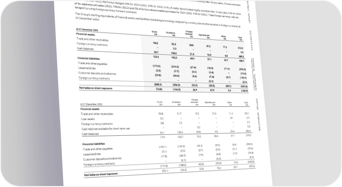 NOTES TO THE FINANCIAL STATEMENTS CONTINUED S S 23 FINANCIAL INSTRUMENTS CONTINUED TR23 FINANCIAL INSTRUMENTS CONTINUED TR Borrowings continued AForeign currency exposure A Derivative option over own shares continued TEThe Group’s exposure to the risk of changes in foreign currency exchange relates primarily to US dollar sales (including inter-Group sales), Chinese renminbi TE G G I I The warrants can be exercised from 1 July 2021 through to 7 December 2027. The issuance of debt with attached warrants required the Group to assess Csales, Japanese yen sales and Euro denominated purchases. C separately the fair value of the warrants and the debt. The fair value of the warrants was determined using a binomial model used to predict the behaviour R R E At 31 December 2023, the Group hedged 25% for 2024 (2022: 29% for 2023) of its US dollar denominated highly probable inter-Group sales, 53% for 2024 E of the warrant holders and when they might exercise their holdings. The derivative option liability was initially recognised as a derivative forward at fair value P P O of its Japanese yen sales (2022: 19% for 2023) and 0% of its Euro denominated purchases for 2024 (2022: 15% for 2023). These foreign currency risks are O with changes in the fair value being recognised in the Consolidated Income Statement until issuance of the warrants on 7 December 2020 resulting in an R R initial valuation of £34.6m. Upon issuance of the $335m SSNs, the carrying value of the debt was reduced by the same amount. The debt will be increased Thedged by using foreign currency forward contracts. T via an effective interest charge over the term of the SSNs. During the year ended 31 December 2023, changes to the fair value of the derivative option have The Group’s sterling equivalents of financial assets and liabilities (excluding borrowings analysed by currency above) denominated in foreign currencies at resulted in a debit to the Consolidated Income Statement of £19.0m (2022: £8.4m credit to the Consolidated Income Statement) which is presented in G31 December were: G adjusting items. A total of 29,969,927 (2022: nil warrants) were exercised, resulting in a £18.6m reduction to the liability (2022: no change to the associated O O liability). VE Chinese VE R Euros US dollars renminbi Japanese yen Other Total R NAN At 31 December 2023 £m £m £m £m £m £m NAN Interest rate risk Financial assets C C The Group is exposed interest rate risk on the RCF attached to the SSNs and on the bilateral RCF facility with HSBC when drawn, whereby Chinese renminbi ETrade and other receivables 94.8 22.2 38.8 41.2 17.2 214.2 E have been deposited in a restricted account with HSBC in China in exchange for a sterling overdraft facility with HSBC in the UK. The interest rate charged on Foreign currency contracts – 3.3 – – – 3.3 both facilities is based on SONIA and compounded in arrears. Cash balances 38.7 166.5 21.6 15.9 6.5 249.2 F F I I Profile NAN 133.5 192.0 60.4 57.1 23.7 466.7 NAN At 31 December the interest rate profile of the Group’s interest-bearing financial instruments was: C Financial liabilities C 2023 2022 IAL Trade and other payables (172.5) (274.0) (27.6) (16.3) (11.6) (502.0) IAL £m £m S Lease liabilities (2.0) (7.7) (0.3) (3.4) – (13.4) S Fixed rate instruments T T A A T Customer deposits and advances (33.8) (54.6) (5.6) (7.4) (8.7) (110.1) T Financial liabilities 980.3 1,104.0 E E M Foreign currency contracts – – – (2.1) – (2.1) M E E N (208.3) (336.3) (33.5) (29.2) (20.3) (627.6) N T T Variable rate instruments SNet balance sheet exposure (74.8) (144.3) 26.9 27.9 3.4 (160.9) S Financial liabilities 89.4 107.1 F F U Chinese U The SSNs, are at fixed interest rates. The rate of interest on the RCF, which is attached to the SSNs, and the bilateral RCF are based on SONIA plus a R R T Euros US dollars renminbi Japanese yen Other Total T percentage spread. As SONIA varies on a daily basis both the RCF and bilateral RCF are considered to be variable rate instruments. The bilateral is now HAt 31 December 2022 £m £m £m £m £m £m H E E drawn as at 31 December 2023. R R Financial assets INF Trade and other receivables 50.8 21.7 15.2 31.0 11.4 130.1 INF In 2023 and 2022, the Group entered into an inventory repurchase arrangement (not included within the financial liabilities noted above). The interest OR OR charged on this arrangement is determined as the difference between the sales and repurchase value and is therefore fixed at the time of entering into Loan assets 0.2 – – – 0.1 0.3 the arrangement. The repayment terms of this arrangement are not in excess of 270 days. M M A A Foreign currency contracts 0.8 1.5 – – – 2.3 T T I I Surplus cash funds, when appropriate, are placed on deposit and attract interest at variable rates. ONCash held not available for short-term use – – 0.3 – – 0.3 ON Interest rate risks – sensitivity Cash balances 26.1 130.5 59.8 4.5 25.6 246.5 The following table demonstrates the sensitivity, with all other variables held constant, of the Group’s loss after tax to a reasonably possible change in 77.9 153.7 75.3 35.5 37.1 379.5 interest rates on the bilateral RCF with HSBC and the RCF attached to the SSNs. Financial liabilities 2023 2022 Trade and other payables (153.1) (134.3) (34.2) (9.5) (5.4) (336.5) £m £m Lease liabilities (0.1) (9.5) (0.7) (5.0) (0.1) (15.4) Increase/ Effect Effect Customer deposits and advances (17.8) (44.3) (7.6) (4.8) (1.9) (76.4) (decrease) in on loss on loss interest rate after tax after tax Foreign currency contracts – (0.1) – (0.6) – (0.7) SONIA (3.0%) (2.1) (2.6) (171.0) (188.2) (42.5) (19.9) (7.4) (429.0) SONIA 3.0% 2.1 2.6 Net balance sheet exposure (93.1) (34.5) 32.8 15.6 29.7 (49.5) ASTON MARTIN LAGONDA ANNUAL REPORT AND ACCOUNTS 2023 179