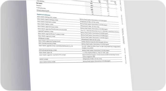 NOTES TO THE FINANCIAL STATEMENTS CONTINUED S S 33 GROUP COMPANIES TR 33 GROUP COMPANIES CONTINUED TR In accordance with Section 409 of the Companies Act 2006, a full list of entities in which the Group has an interest of greater than or equal to 20%, the A Aston Martin Aston Martin A registered office and effective percentage of equity owned as at 31 December 2023 are disclosed below. TE Works Limited AMWS Limited Works Limited AMWS Limited TE G 2023 2023 2022 2022 G I £m £m £m £m I C C Investments in subsidiary undertakings R R Total assets 45.3 – 42.5 – Proportion of E E voting rights P P Total liabilities (4.1) – (3.8) – Subsidiary undertakings Holding and shares held Nature of business O O R R T T Aston Martin Holdings (UK) Limited* Ordinary 100% Dormant company Net assets 41.2 – 38.7 – Aston Martin Capital Holdings Limited**◊ Ordinary 100% Financing company holding the Senior Secured Notes Revenue 42.0 – 40.6 – Profit before tax 2.5 – 1.7 – Aston Martin Investments Limited** Ordinary 100% Holding company G G O O Group’s share of profit 1.3 – 0.9 – Aston Martin Capital Limited**◊ Ordinary 100% Dormant company – financing company that held Senior VE VE Secured Notes that were repaid in 2017 R R Aston Martin Lagonda Group Limited** Ordinary 100% Holding company NANRegistered addresses NAN Aston Martin Holdings (UK) Limited Banbury Road, Gaydon, Warwickshire, CV35 0DB, England Aston Martin Lagonda of North America Incorporated**^ Ordinary 100% Luxury sports car distributor C C Lagonda Properties Limited** Ordinary 100% Dormant company EAston Martin Capital Holdings Limited 28 Esplanade, St Helier, JE2 3QA, Jersey E Aston Martin Lagonda Pension Trustees Limited** Ordinary 100% Trustee of the Aston Martin Lagonda Limited Aston Martin Investments Limited Banbury Road, Gaydon, Warwickshire, CV35 0DB, England Pension Scheme F Aston Martin Capital Limited 28 Esplanade, St Helier, JE2 3QA, Jersey F I I Aston Martin Lagonda Limited** Ordinary 100% Manufacture and sale of luxury sports cars, the sale of NANAston Martin Lagonda Group Limited Banbury Road, Gaydon, Warwickshire, CV35 0DB, England NAN parts, brand licensing and motorsport activities CAston Martin Lagonda of North America Incorporated Floor 22, 11 West 42nd Street, New York, NY, 10036-8002, United States of America C AM Brands Limited**◊ Ordinary 100% Non-trading company IALLagonda Properties Limited Banbury Road, Gaydon, Warwickshire, CV35 0DB, England IAL Aston Martin Lagonda of Europe GmbH**> Ordinary 100% Provision of engineering and sales and marketing services SAston Martin Lagonda Pension Trustees Limited Banbury Road, Gaydon, Warwickshire, CV35 0DB, England S T T A A AML Overseas Services Limited** Ordinary 100% Dormant company TAston Martin Lagonda Limited Banbury Road, Gaydon, Warwickshire, CV35 0DB, England T E E Aston Martin Lagonda (China) Automobile Distribution Co., Ltd**√ Ordinary 100% Luxury sports car distributor MAM Brands Limited 28 Esplanade, St Helier,JE2 3QA, Jersey M E E N N AM Nurburgring Racing Limited** Ordinary 100% Dormant company TAston Martin Lagonda of Europe GmbH Gottlieb-Daimler-Strasse 30, 53520 Meuspath, Germany T Aston Martin Japan GK**> Ordinary 100% Operator of the sales function in Singapore and certain F F U Shanghai, China 200001 U other countries in the Asia Pacific region R R T AM Nurburgring Racing Limited Banbury Road, Gaydon, Warwickshire, CV35 0DB, England T H H AMWS Limited**◊ Ordinary 50%*** Holding company E E R Aston Martin Japan GK 1-2-3 Kita-Aoyama, Minato-ku, Tokyo 107-0061, Japan R Aston Martin Works Limited** Ordinary 50%*** Sale, servicing and restoration of Aston Martin cars INFAston Martin Lagonda – Asia Pacific PTE Limited Baker & McKenzie Singapore – 8 Marina Boulevard, #05-02 Marina Bay Financial INF All subsidiaries are incorporated in England and Wales unless otherwise stated. OR Centre, Singapore 018981 OR M AMWS Limited 28 Esplanade, St Helier, JE2 3QA, Jersey M ◊ Incorporated in Jersey (tax resident in the UK) A A T Aston Martin Works Limited Banbury Road, Gaydon, Warwickshire, CV35 0DB, England T ^ Incorporated in the USA I I > Incorporated in Germany ON ON > Incorporated in Singapore √ Incorporated in the People’s Republic of China * Held directly by Aston Martin Lagonda Global Holdings plc ** Held indirectly by Aston Martin Lagonda Global Holdings plc *** The Group exercises management control of these legal entities and therefore the results, assets and liabilities have been wholly included in the Consolidated Financial Statements. The individual results, aggregate assets and aggregate liabilities included within the Consolidated Financial Statements are summarised on pages 142-146. ASTON MARTIN LAGONDA ANNUAL REPORT AND ACCOUNTS 2023 197