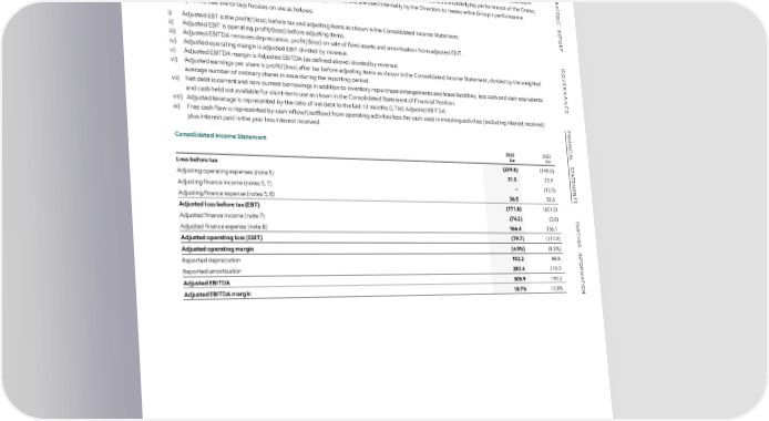 FFIINANNANCCIALIAL S STTAATTEEMMEENNTTSS NOTES TO THE FINANCIAL STATEMENTS CONTINUED S 34 ALTERNATIVE PERFORMANCE MEASURES TR In the reporting of financial information, the Directors have adopted various Alternative Performance Measures ("APMs"). APMs should be considered in A addition to IFRS measurements. The Directors believe that these APMs assist in providing useful information on the underlying performance of the Group, TE G I enhance the comparability of information between reporting periods, and are used internally by the Directors to measure the Group's performance. C R The key APMs that the Group focuses on are as follows: E P O i) Adjusted EBT is the profit/(loss) before tax and adjusting items as shown in the Consolidated Income Statement. R ii) Adjusted EBIT is operating profit/(loss) before adjusting items. T iii) Adjusted EBITDA removes depreciation, profit/(loss) on sale of fixed assets and amortisation from adjusted EBIT. iv) Adjusted operating margin is adjusted EBIT divided by revenue. G O v) Adjusted EBITDA margin is Adjusted EBITDA (as defined above) divided by revenue. VE vi) Adjusted earnings per share is profit/(loss) after tax before adjusting items as shown in the Consolidated Income Statement, divided by the weighted R average number of ordinary shares in issue during the reporting period. NAN vii) Net debt is current and non-current borrowings in addition to inventory repurchase arrangements and lease liabilities, less cash and cash equivalents C and cash held not available for short-term use as shown in the Consolidated Statement of Financial Position. E viii) Adjusted leverage is represented by the ratio of net debt to the last 12 months (LTM) Adjusted EBITDA. ix) Free cash flow is represented by cash inflow/(outflow) from operating activities less the cash used in investing activities (excluding interest received) F plus interest paid in the year less interest received. I NAN Consolidated Income Statement C 2023 2022 IAL £m £m S Loss before tax (239.8) (495.0) T A T Adjusting operating expenses (note 5) 31.5 23.9 E M Adjusting finance income (notes 5, 7) – (12.5) E N T Adjusting finance expense (notes 5, 8) 36.5 32.6 S Adjusted loss before tax (EBT) (171.8) (451.0) Adjusted finance income (note 7) (74.3) (3.0) F U Adjusted finance expense (note 8) 166.4 336.1 R T H Adjusted operating loss (EBIT) (79.7) (117.9) E R Adjusted operating margin (4.9%) (8.5%) INF Reported depreciation 102.2 88.8 Reported amortisation 283.4 219.3 OR M Adjusted EBITDA 305.9 190.2 A T I Adjusted EBITDA margin 18.7% 13.8% ON ASTON MARTIN LAGONDA ANNUAL REPORT AND ACCOUNTS 2023 198