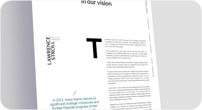 STRATEGIC REPORT EXECUTIVE CHAIRMAN’S STATEMENT SS TRTR AA Accelerating forward TETE GG II CC R R in our vision EE PP OO RR TT GG OO VEVE RR NANNAN CC EE FF II NANNAN CC th IALIAL he historic year of our 110 anniversary, 2023 marked an important EXECUTIVE ECHAIRMAN S S crossroads for Aston Martin Lagonda. An opportunity to reflect on TT C our rich heritage and progress to date, whilst accelerating forward AA L TT in our vision for the Company. EE L MM N EE NN E It’s now almost four years since I became Executive Chairman. As TT O I outlined at our Capital Markets Day in June 2023, we have made SS R R tremendous progress within that time, transforming our brand, our T FF Tproduct portfolio, and our balance sheet. UU RR S TT AW HH In 2023, Aston Martin delivered significant strategic milestones and EE RR L further financial progress, driven by continued strong demand for INF INF our ultra-luxury, high-performance products. OROR As a high-performance car enthusiast myself, I take immense personal MM AA pride in the collection of stunning new models we’ve introduced to our TT II community of owners and enthusiasts around the world. From our ONON critically acclaimed DBX707 luxury SUV, through to our instantly iconic new front-engine sports cars and groundbreaking mid-engine programme. In 2023, the rich mix of sales from this breathtaking product portfolio, driven by our ongoing commitment to innovation, supported growth in average selling prices to record levels. This, combined with our ongoing portfolio transformation, resulted in a significantly enhanced In 2023, Aston Martin delivered gross margin, remaining on track to achieve our longstanding target of around 40% gross margin in 2024. significant strategic milestones and Aligned to our vision of creating the most comprehensive product further financial progress, driven portfolio in our segment, we launched the highly acclaimed DB12 by continued strong demand in 2023. We have seen a clear demonstration of DB12 and our other ultra-luxury vehicles addressing the growing demand for unique for our ultra-luxury, personalised products, driving increased options revenue while high-performance products.” also attracting new customers to the brand. This arrival of important and innovative new products is further boosted by our continued investment in establishing Aston Martin as an ultra-luxury, high-performance brand – supercharged by our successful return to the pinnacle of motorsport, Formula One®. ASTON MARTIN LAGONDA ANNUAL REPORT AND ACCOUNTS 2023 14