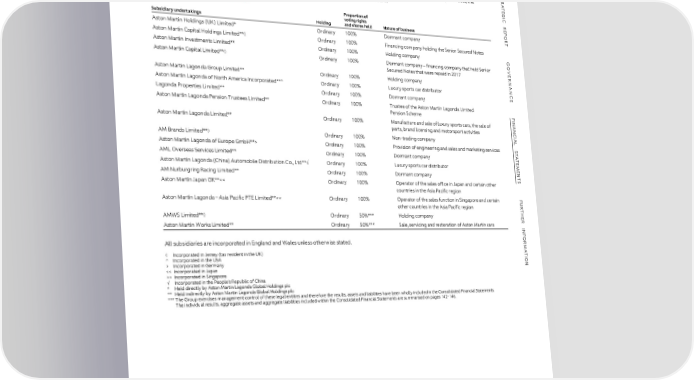 FFIINANNANCCIALIAL S STTAATTEEMMEENNTTSS NOTES TO THE FINANCIAL STATEMENTS CONTINUED S 33 GROUP COMPANIES TR In accordance with Section 409 of the Companies Act 2006, a full list of entities in which the Group has an interest of greater than or equal to 20%, the A registered office and effective percentage of equity owned as at 31 December 2023 are disclosed below. TE G I C Investments in subsidiary undertakings R Proportion of E voting rights P Subsidiary undertakings Holding and shares held Nature of business O R Aston Martin Holdings (UK) Limited* Ordinary 100% Dormant company T Aston Martin Capital Holdings Limited**◊ Ordinary 100% Financing company holding the Senior Secured Notes Aston Martin Investments Limited** Ordinary 100% Holding company G O Aston Martin Capital Limited**◊ Ordinary 100% Dormant company – financing company that held Senior VE Secured Notes that were repaid in 2017 R Aston Martin Lagonda Group Limited** Ordinary 100% Holding company NAN Aston Martin Lagonda of North America Incorporated**^ Ordinary 100% Luxury sports car distributor C Lagonda Properties Limited** Ordinary 100% Dormant company E Aston Martin Lagonda Pension Trustees Limited** Ordinary 100% Trustee of the Aston Martin Lagonda Limited Pension Scheme F I Aston Martin Lagonda Limited** Ordinary 100% Manufacture and sale of luxury sports cars, the sale of NAN parts, brand licensing and motorsport activities C AM Brands Limited**◊ Ordinary 100% Non-trading company IAL Aston Martin Lagonda of Europe GmbH**> Ordinary 100% Provision of engineering and sales and marketing services S T A AML Overseas Services Limited** Ordinary 100% Dormant company T E Aston Martin Lagonda (China) Automobile Distribution Co., Ltd**√ Ordinary 100% Luxury sports car distributor M E N AM Nurburgring Racing Limited** Ordinary 100% Dormant company T Aston Martin Japan GK**> Ordinary 100% Operator of the sales function in Singapore and certain F U other countries in the Asia Pacific region R T H AMWS Limited**◊ Ordinary 50%*** Holding company E R Aston Martin Works Limited** Ordinary 50%*** Sale, servicing and restoration of Aston Martin cars INF All subsidiaries are incorporated in England and Wales unless otherwise stated. OR M ◊ Incorporated in Jersey (tax resident in the UK) A T ^ Incorporated in the USA I > Incorporated in Germany ON > Incorporated in Singapore √ Incorporated in the People’s Republic of China * Held directly by Aston Martin Lagonda Global Holdings plc ** Held indirectly by Aston Martin Lagonda Global Holdings plc *** The Group exercises management control of these legal entities and therefore the results, assets and liabilities have been wholly included in the Consolidated Financial Statements. The individual results, aggregate assets and aggregate liabilities included within the Consolidated Financial Statements are summarised on pages 142-146. ASTON MARTIN LAGONDA ANNUAL REPORT AND ACCOUNTS 2023 196
