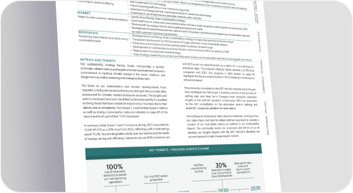 STRATEGIC REPORT TASK FORCE ON CLIMATE-RELATED FINANCIAL DISCLOSURES CONTINUED S POLICY – R&D investment to develop lower fleet emissions portfolio TR Managing our exposure to changes in – Maintenance of small volume derogation status exemptions where available A – Establishment of emissions-pooling agreements with third parties to manage exposure to carbon pricing TE legislation G I – Consideration of forward purchasing of carbon offsets to manage exposure to increased pricing and reduced capacity C TECHNOLOGY – R&D investment in EV technology R E Modifying our product offering – Improving energy efÏciency in our manufacturing plants P O – Selection of a strategic partner to provide access to EV powertrain technology R – Investment in use of alternative sustainable materials within vehicles T MARKET – Launch of our Racing. Green. sustainability strategy Adapt to meet customer needs and desires – Continued focus on waste reduction and elimination with zero single-use plastic waste target to be achieved by 2025 G – Working with our supply chain to reduce global emissions and waste O – Development of electrified powertrain options within the product portfolio and increased use of sustainable materials VE to meet customers’ evolving requirements R REPUTATION – Development of our Racing. Green. sustainability strategy to respond proactively to climate change NAN Positioning Aston Martin as an ultra-luxury – Transparent disclosure of our GHG emissions through publication of our Sustainability Report C sustainable brand – Enhanced communication of actions already taken to address climate change E – Development of credible plans to achieve net zero carbon emissions within our plants by 2030 – Deployment of our bold new brand strategy – Clear strategy to electrify our product portfolio and increase use of sustainable materials (including green aluminium) F I NAN METRICS AND TARGETS unit (tCO2e per car manufactured) as a metric for a normalizing our C Our sustainability strategy Racing. Green. incorporates a number emissions data. This emission intensity metric showed a 23.3% drop IAL of climate-related metrics and targets which demonstrate the Company’s compared with 2022. Our progress in 2023 section on page 45 S commitment to tackling climate change in the short-, medium- and highlights the key accomplishments in 2023 related to minimising our T A T longer-term as well as assessing and managing these risks. emissions impact. E M E N We listen to our stakeholders and monitor developments from We previously committed to the SBTi Net-Zero Standard and this year T regulatory and governance bodies to provide input into our materiality have developed our full Scope 3 inventory and are in the process of S assessment for climate-related disclosure purposes. The targets and setting near and long term Company-wide emissions reduction metrics disclosed have been identified by the Sustainability Committee targets in line with the standard. In November 2023 we responded F U as being those that have a material impact on our business due to their to the SBTi consultation on the automaker sectors pathway and R T nature, size or complexity. Our Scope 1, 2 and limited Scope 3 metrics await SBTi reopening validation for automakers. H E as well as energy consumption data are included on page 49 of this R report and form part of this TCFD disclosure. We continue to enhance our data collection methods, working across INF our value chain, and seek to obtain external assurance to validate a OR In summary total Scope 1 and 2 emissions during 2023 amounted to number of our reportable metrics as outlined in our Sustainability M A 13,617.49 tCO2e, a 25% drop from 2022, reflecting a all in total energy Report. We continually review our processes and will do so as we T I use of 11.2%. To provide greater clarity over our actions and the results develop our targets aligned with the SBTi Net-Zero standard, our ON of energy saving and efÏciency measures we use GHG emissions per current relevant climate change targets include: KEY TARGETS – TACKLING CLIMATE CHANGE 100% Net-Zero Clear plan to have Use of renewable manufacturing 30% a line up of electricity to power facilities Reduction in supply electric sports our manufacturing Our first PHEV enters chain CO emissions 2 cars and SUVs operations production (from 2020 baseline) 2019 2022 2024 2025 2030 2039 Zero single-use Target for launch Net-Zero across 2.5% plastic packaging 15% our supply chain of our first BEV Reduce CO emissions Reduction in water 2 waste in 2026 from our manufacturing consumption (from operations by 2.5% 2019 baseline) year-on-year* * Scope 1 emissions as per Racing. Green. strategy. ASTON MARTIN LAGONDA ANNUAL REPORT AND ACCOUNTS 2023 62