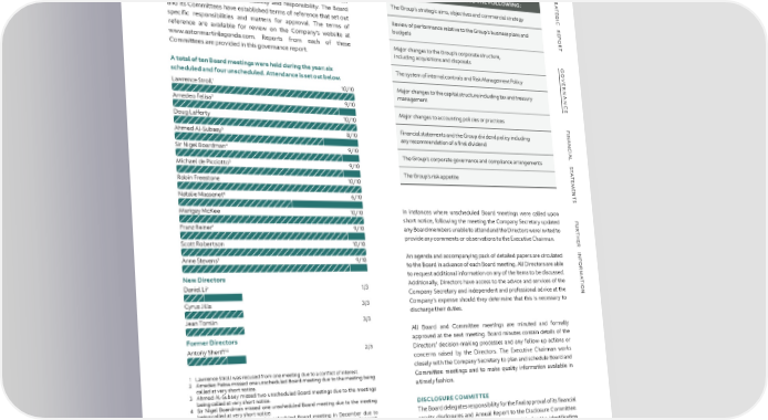 S S TR GOVERNANCE FRAMEWORK THE BOARD’S TERMS OF REFERENCE STATE THAT IT TR A The Company’s corporate governance framework is set out on pages A TE 85-87 and provides an overview of the roles of the Board, its MUST CONSIDER AND APPROVE THE FOLLOWING: TE G G I I C Committees and members of the Executive Committee which The Group’s strategic aims, objectives and commercial strategy C R provides clear lines of accountability and responsibility. The Board R E E P and its Committees have established terms of reference that set out P O Review of performance relative to the Group’s business plans and O R specific responsibilities and matters for approval. The terms of budgets R T reference are available for review on the Company’s website at T www.astonmartinlagonda.com. Reports from each of these Major changes to the Group’s corporate structure, G Committees are provided in this governance report. including acquisitions and disposals G O O VE VE R A total of ten Board meetings were held during the year: six The system of internal controls and Risk Management Policy R NAN scheduled and four unscheduled. Attendance is set out below. NAN 1 Major changes to the capital structure including tax and treasury Lawrence Stroll 10/10 C management C E Amedeo Felisa2 9/10 E Major changes to accounting policies or practices F Doug Lafferty 10/10 F I I NAN Financial statements and the Group dividend policy including NAN 3 Ahmed Al-Subaey 8/10 C any recommendation of a final dividend C IAL Sir Nigel Boardman4 9/10 IAL S The Group’s corporate governance and compliance arrangements S T 5 T A Michael de Picciotto 9/10 A T T E The Group’s risk appetite E M M E Robin Freestone 10/10 E N N T T S 6 S Natalie Massenet 6/10 Marigay McKee 10/10 In instances where unscheduled Board meetings were called upon F F U short notice, following the meeting the Company Secretary updated U R 7 R T Franz Reiner 9/10 any Board members unable to attend and the Directors were invited to T H H E provide any comments or observations to the Executive Chairman. E R Scott Robertson 10/10 R INF INF Anne Stevens8 9/10 An agenda and accompanying pack of detailed papers are circulated OR to the Board in advance of each Board meeting. All Directors are able OR M to request additional information on any of the items to be discussed. M A New Directors A T Additionally, Directors have access to the advice and services of the T I 9 I ON Daniel Li 1/3 Company Secretary and independent and professional advice at the ON Cyrus Jilla 3/3 Company’s expense should they determine that this is necessary to discharge their duties. Jean Tomlin 3/3 All Board and Committee meetings are minuted and formally Former Directors approved at the next meeting. Board minutes contain details of the 10 Antony Sheriff 2/3 Directors’ decision-making processes and any follow-up actions or concerns raised by the Directors. The Executive Chairman works closely with the Company Secretary to plan and schedule Board and 1 Lawrence Stroll was recused from one meeting due to a conflict of interest. Committee meetings and to make quality information available in 2 Amedeo Felisa missed one unscheduled Board meeting due to the meeting being called at very short notice. a timely fashion. 3 Ahmed Al-Subaey missed two unscheduled Board meetings due to the meetings being called at very short notice. 4 Sir Nigel Boardman missed one unscheduled Board meeting due to the meeting DISCLOSURE COMMITTEE being called at very short notice. 5 Michael de Picciotto missed a scheduled Board meeting in December due to The Board delegates responsibility for the final approval of its financial disrupted travel. He was also recused from one meeting due to a conflict of interest. results disclosures and Annual Report to the Disclosure Committee. 6 Natalie Massenet missed three unscheduled Board meetings due to the meetings being called at very short notice and the Board Strategy Day due to personal The Disclosure Committee is also responsible for the identification circumstances. and disclosure of inside information. The Disclosure Committee is 7 Franz Reiner missed one unscheduled Board meeting due to the meeting being called at very short notice. 8 Anne Stevens missed one unscheduled Board meeting due to the meeting being chaired by the Chief Financial OfÏcer with the Chief Executive OfÏcer, called at very short notice. General Counsel, Company Secretary, Head of Investor Relations, 9 Daniel Li missed one unscheduled Board meeting due to the meeting being called at Director of Internal Audit & Risk, Group Financial Controller and very short notice and one scheduled Board meeting due to other commitments the Director of Financial Planning & Analysis as members of which were pre-existing prior to Daniel joining the Board. 10 Antony Sheriff was absent for one scheduled Board meeting. the Committee. ASTON MARTIN LAGONDA ANNUAL REPORT AND ACCOUNTS 2023 83